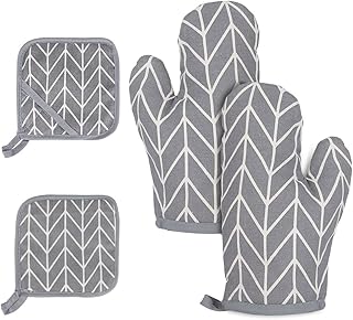 Gants de Cuisine, Maniques Cuisine, Doublure en Coton Gant de Four avec Boucle de Suspension, Anti Chaleur Mitaine pour Para Cuisine/Grillade/Cuisson/Patisserie, (2 Gants de Four + 2 Maniques, Gris)